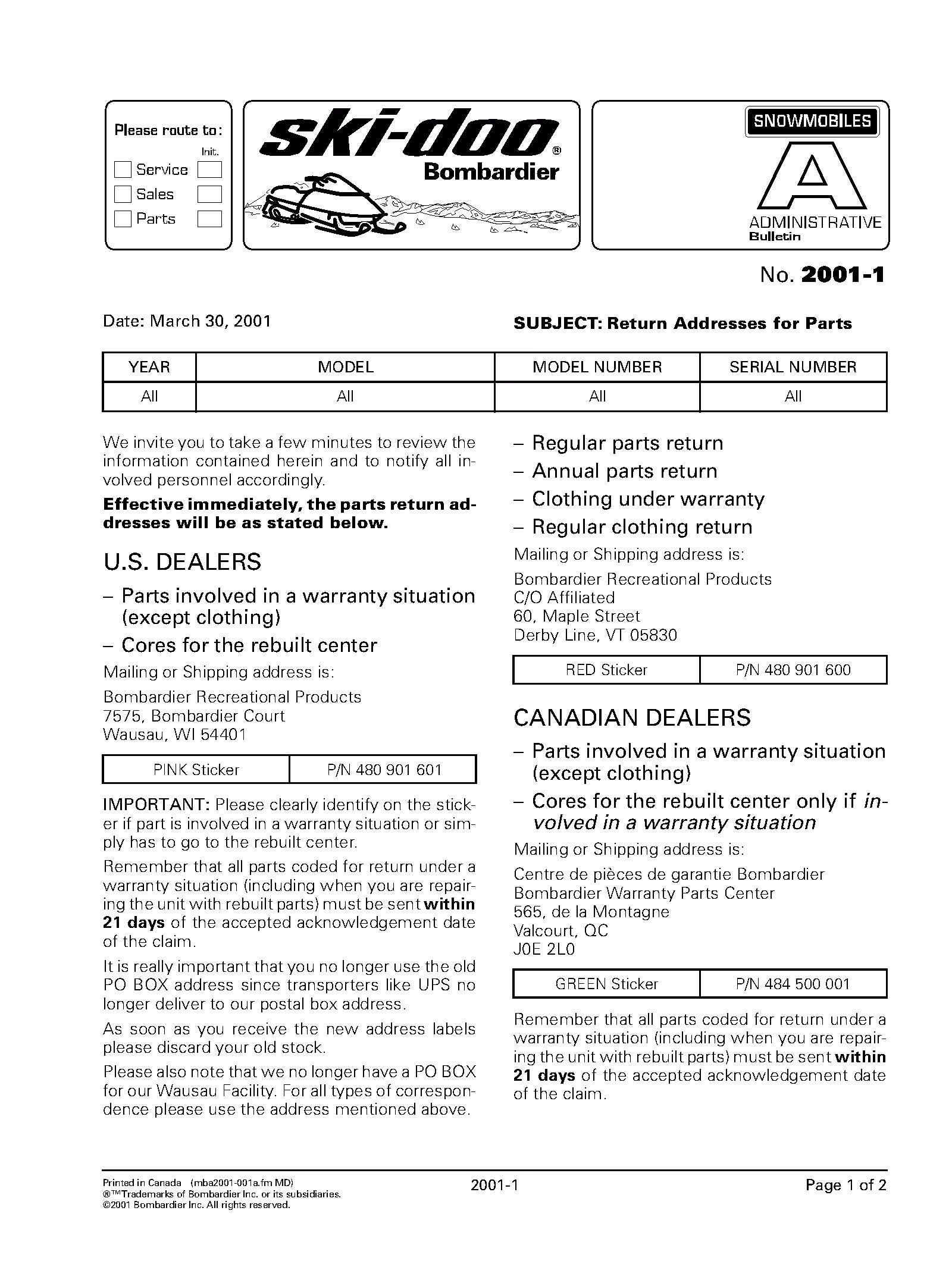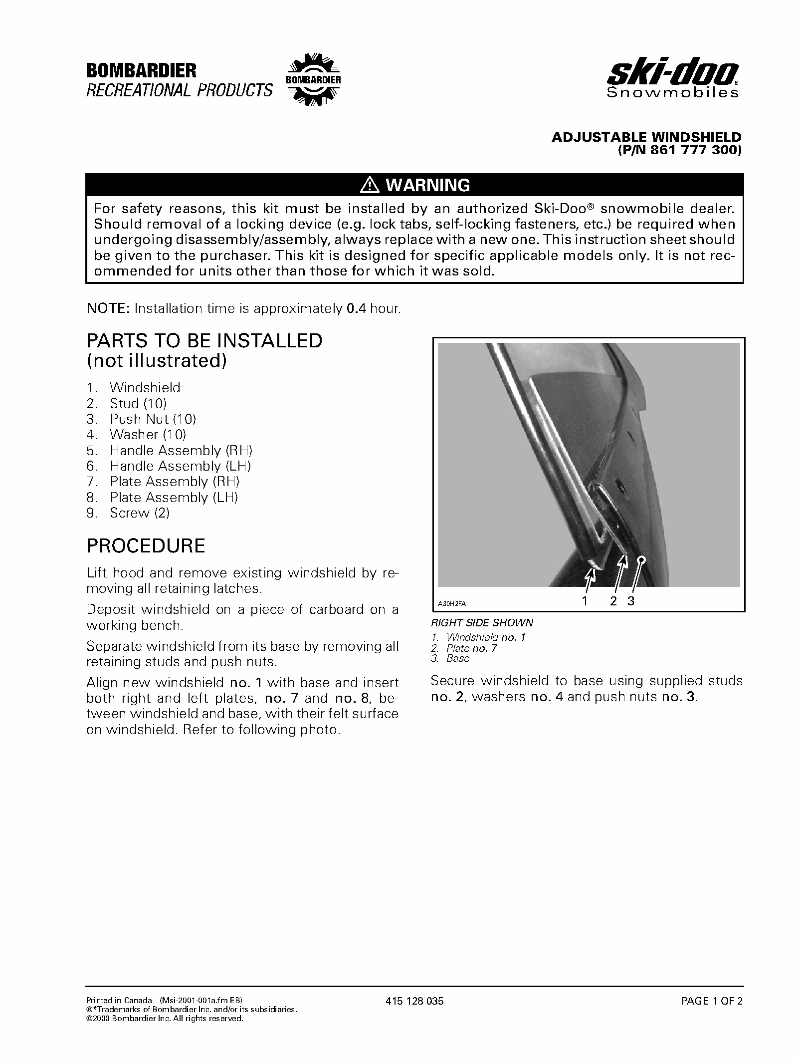 Download your 2001 Ski-Doo Parts Catalog, Racing Handbook, Available Kits, Safety Handbook, Flat Rate Schedule, Specifications Booklet, Operators Guide Manuals today from SledManuals and ensure your machine stays in peak condition all season long.